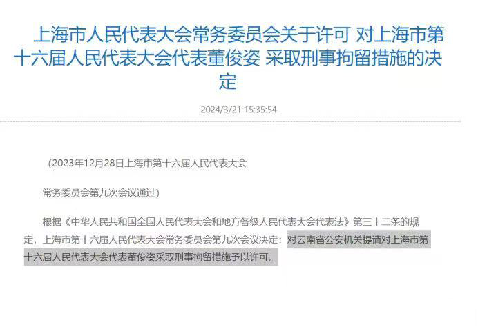 来源为2024年3月份上海市人大发布的一则公报,该公报显示上海市十六届人大常委会九次会议决定:对云南省公安机关提请对上海市十六届人大代表董俊姿采取刑事拘留措施予以许可。
