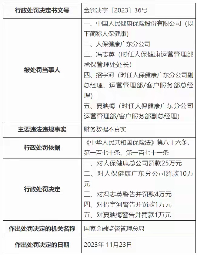 因财务数据不真实,国家金融监督管理总局对中国人民健康保险股份有限公司总公司罚款25万元;对人保健康广东分公司罚款10万元;对时任人保健康运营管理部承保管理处处长冯志英警告并罚款4万元;对时任人保健康广东分公司副总经理、运营管理部/客户服务部总经理招宇河警告并罚款1万元;对时任人保健康广东分公司运营管理部/客户服务部副总经理夏映梅警告并罚款1万元。