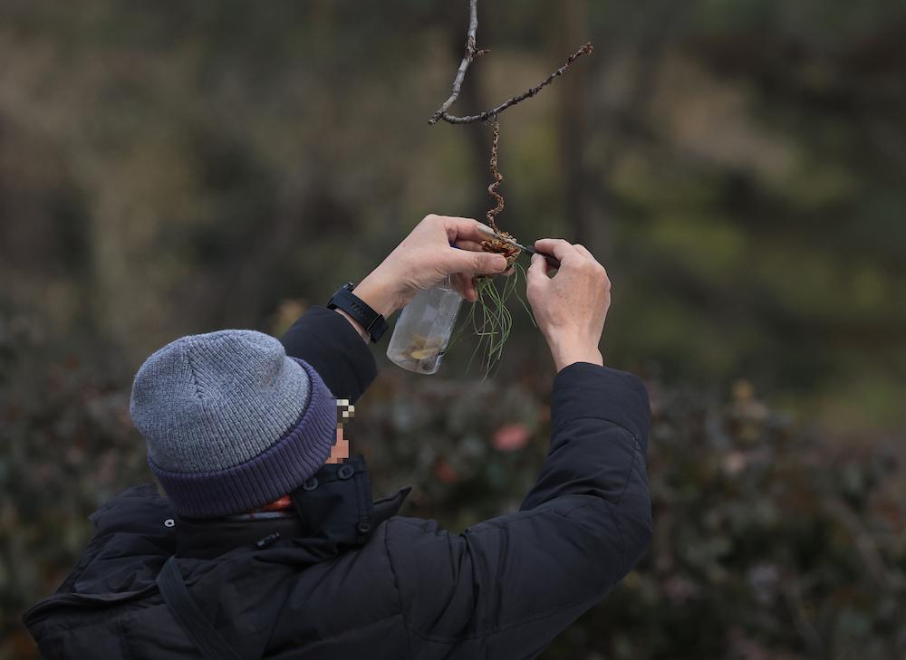 12月16日12时,玉渊潭公园樱花区玉树临风,一位拍摄者在枝头挂上松球涂抹蜂蜜,为诱拍做准备。 记者摄