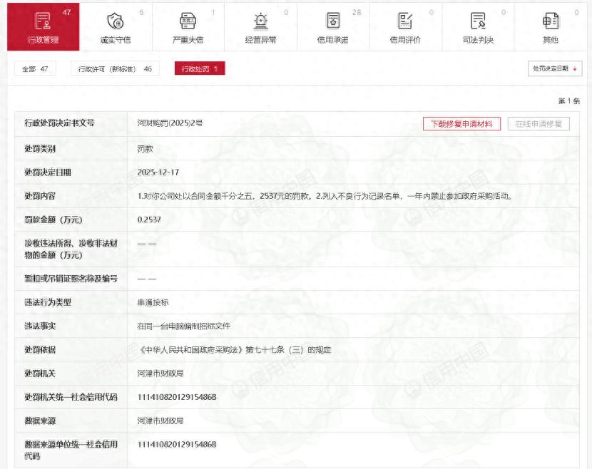 根据信用中国网站最新公示的行政处罚信息,榆林四通工程监理咨询有限公司在政府采购活动中存在违法行为,受到财政部门的严厉处罚。 信息显示,河津市财政局于2025年12月17日作出行政处罚决定(河财购罚(2025)2号)。经查,榆