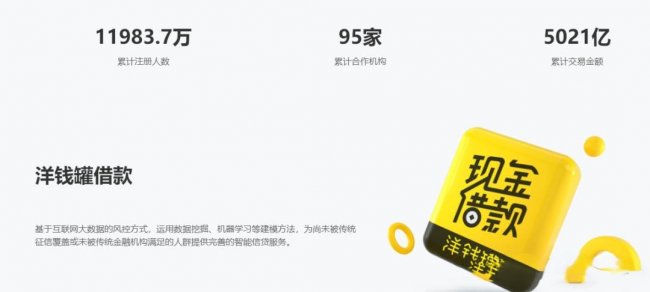 官网信息显示,洋钱罐借款平台基于互联网大数据的风控方式,运用数据挖掘、机器学习等建模方法,为尚未被传统征信覆盖或未被传统金融机构满足的人群提供完善的智能信贷服务。累计注册人数已经接近1.2亿,累计合作机构5家,累计交易金额5021亿。