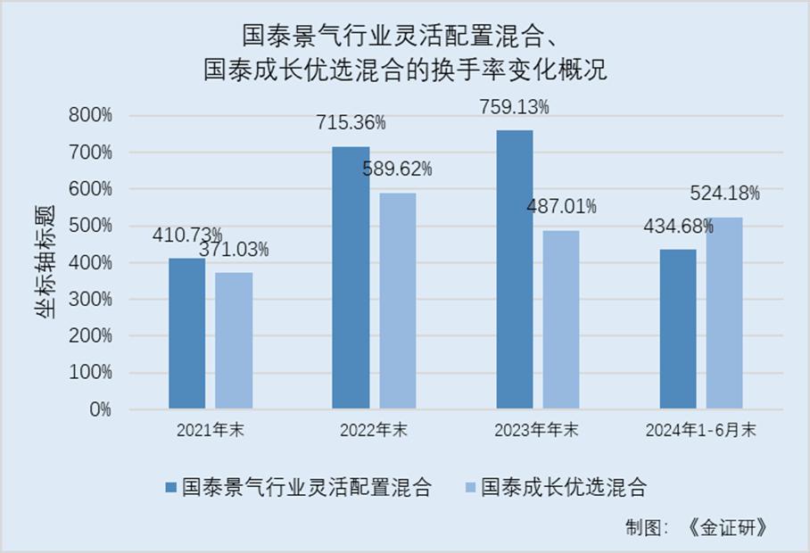 数据显示,截至2021-2023年年末及2024年1-6月末,国泰景气行业灵活配置混合的换手率分别为410.73%、715.36%、759.13%、526.67%;国泰成长优选混合的换手率分别为371.03%、589.62%、487.01%、406.35%。