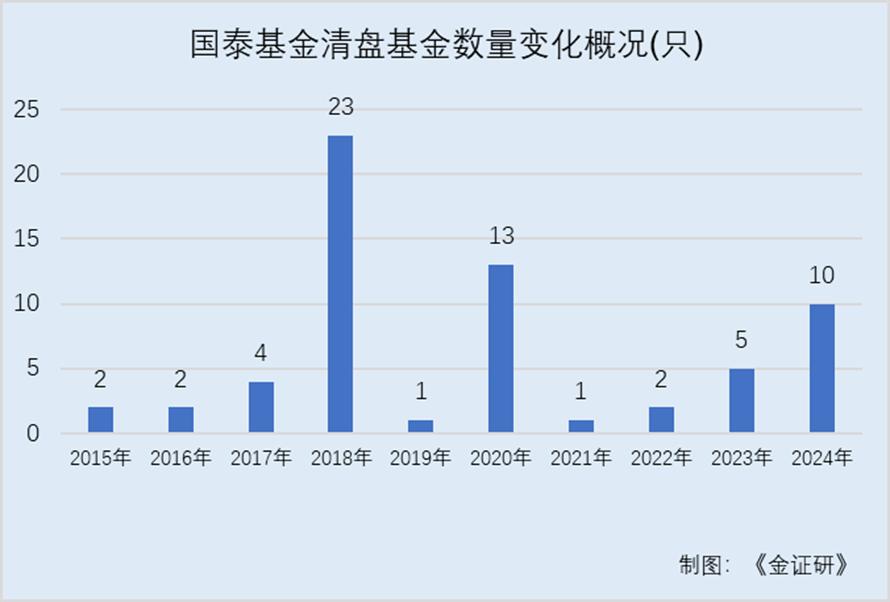 据数据,2019-2024年,国泰基金分别清盘了1只、13只、1只、2只、5只、10只基金。