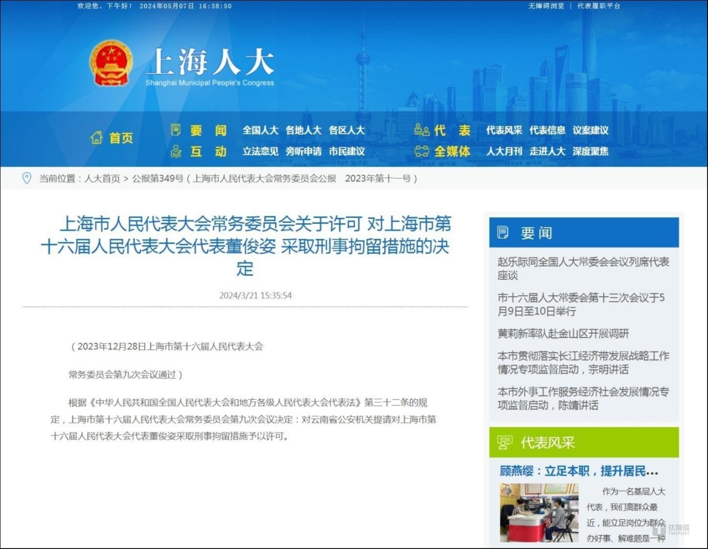根据上海人大网站信息显示,上海市第十六届人民代表大会常务委员会第九次会议决定:对云南省公安机关提请对上海市第十六届人民代表大会代表董俊姿采取刑事拘留措施予以许可。
