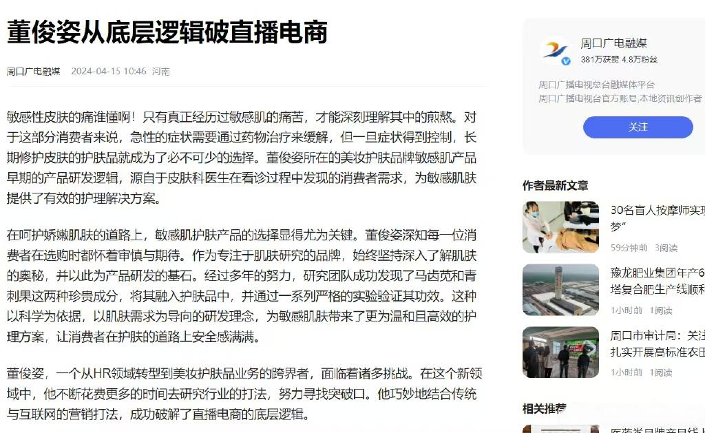 如,周口广电融媒还发布了《董俊姿从底层逻辑破直播电商》,称“董俊姿,一个从HR领域转型到美妆护肤品业务的跨界者......巧妙地结合传统与互联网的营销打法,成功破解了直播电商的底层逻辑。”