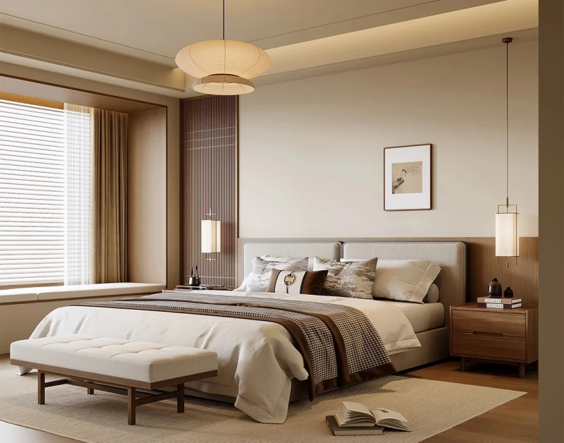 卧室空间:原木系列从地面延伸至背景墙,形成统一温暖的视觉包裹。赤足行走时可感知砖面细腻纹理,搭配柔和灯光与织物,营造出静谧舒适的休憩氛围。