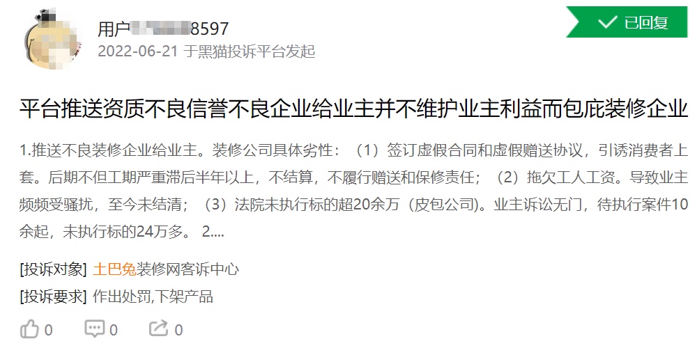 在黑猫投诉上,有用户表示,土巴兔推荐了不良企业给业主,造成了装修工期滞后,装企拖欠工人工资并导致业主被骚扰,甚至存在引诱业主,签订虚假合同和虚假赠送协议。而相关的推荐不良企业给用户的投诉并不少,除了业主表达了土巴兔平台推荐的装企不满外,也有装企表示跟土巴兔签订了网单合作套餐后,土巴兔未及时给装企派单,并导致合同到期后,还有订单未派送,也不退款等情况。