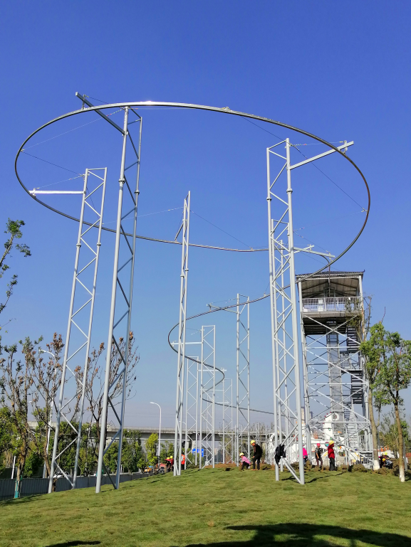 项目组成:站房、轨道、滑车、支撑结构、放行装置、制动装置、回收系统