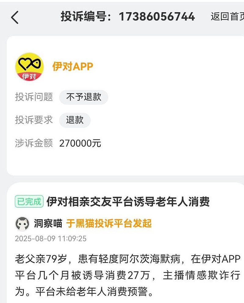在第三方平台黑猫投诉上输入伊对<h-char unicode="ff0c"></h-char>弹出来的有关投诉达到1064条<h-char unicode="ff0c"></h-char>已完成的有935条<h-char unicode="3002"></h-char>投诉内容有虚假宣传<h-char unicode="3001"></h-char>相亲骗局等<h-char unicode="3002"></h-char>