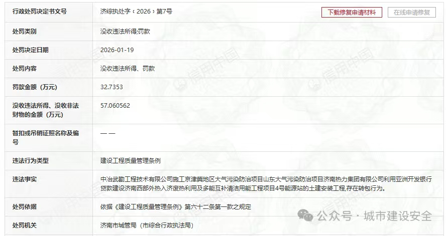 从公开信息了解,2026年1月19日,中冶武勘工程技术有限公司因存在项目转包行为,被济南市城管局(市综合行政执法局)行政处罚合计89.795万元。