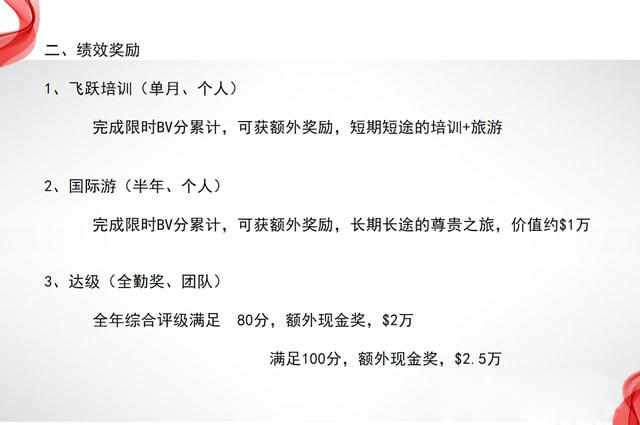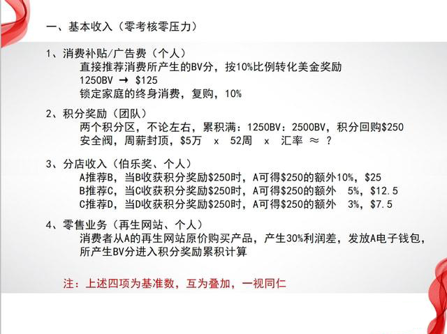相较于售卖产品,“然健环球”的代理商更热衷于用“在一起赚大钱”的说法拉人加入。从代理商们发来的奖金制度中可以知道,然健环球会员有铜级、银级、金级和白金级,购买500BV的产品就成为了金级会员,享受7折购物,但是要当做事业运营,则需要购买1250BV的产品,折合成人民币大概17000多元。成为会员之后可以拿三代的推荐奖和团队奖励,只要发展会员,就可以获得收益。然健环球的最新奖励制度如下: