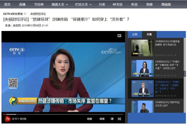 记者注意到,早在2019年1月,然健公司旗下某果汁号称包治百病及涉嫌传销问题被央视新闻曝光(具体报道内容,请网友自行搜索《“然健环球”涉嫌传销 “保健果汁”如何穿上“洋外套”?》后观看)。
