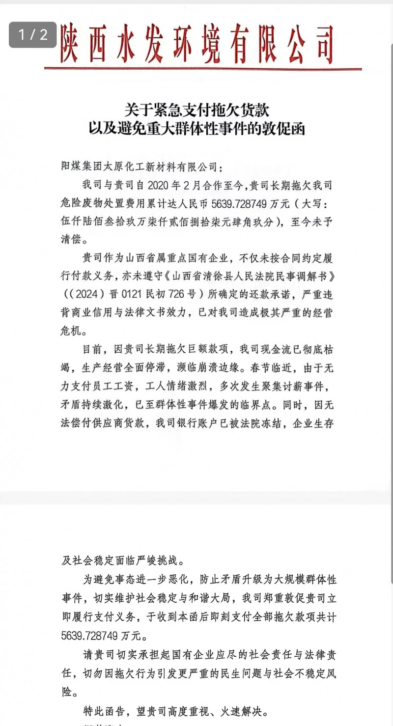 记者获悉,陕西环保企业“陕西水发环境”近日致信山西省主要领导,实名反映其被山西潞安集团控股企业“太原化工新材料有限公司”长期拖欠巨额款项,总额已超过6100万元。由于资金链彻底断裂,该企业濒临破产,数百名工人工资被拖欠长达一年多,生活陷入绝境,群体性事件风险一触即发。