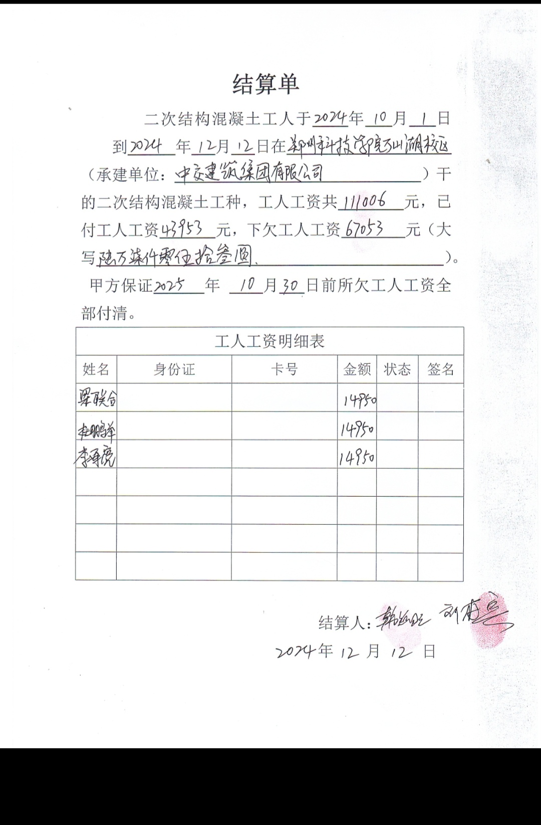 中交建筑集团有限公司承建的河南省郑州科技学院万山湖校区一期一标段项目。我们6人从2024年10月1日开始在这里干二次结构混凝土工种,2024年12月12日结束,开有书面文字结算证明。之前多次催要,一直没有结清,至今下欠我们工