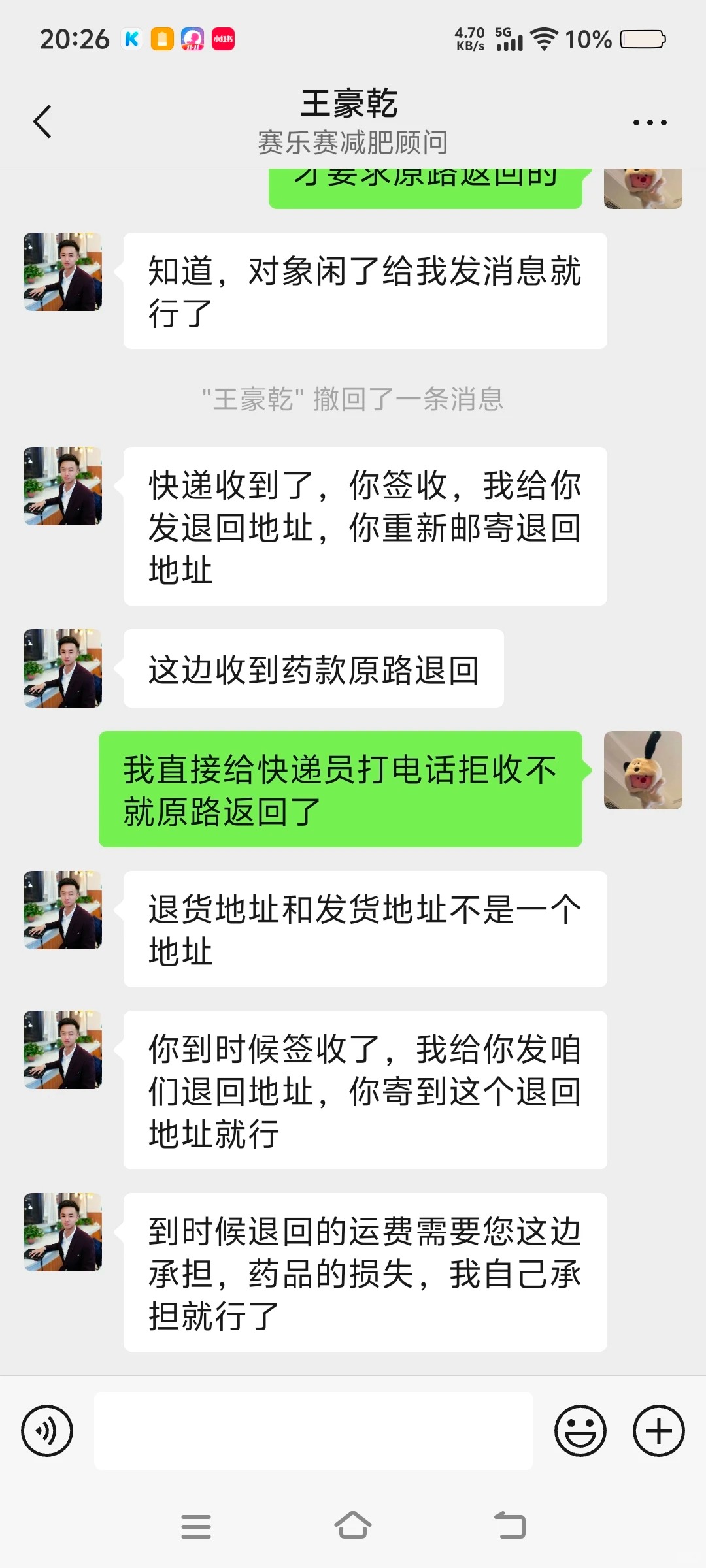 对象在微商买了奥利司他胶囊,我上网查了有很多副作用,医生也说他的教程搭配就是让人拉的,所以我要求退货退款,她不愿意说药品卖了不能退了,我就说这不是你企业生产的吗?还可以批发呢看介绍,我可以12315投诉,然后他就可以退,让我签收了再寄给他,我说拒收不就好了么,他给回答可靠吗?不会签收了就找理由不给退了吧