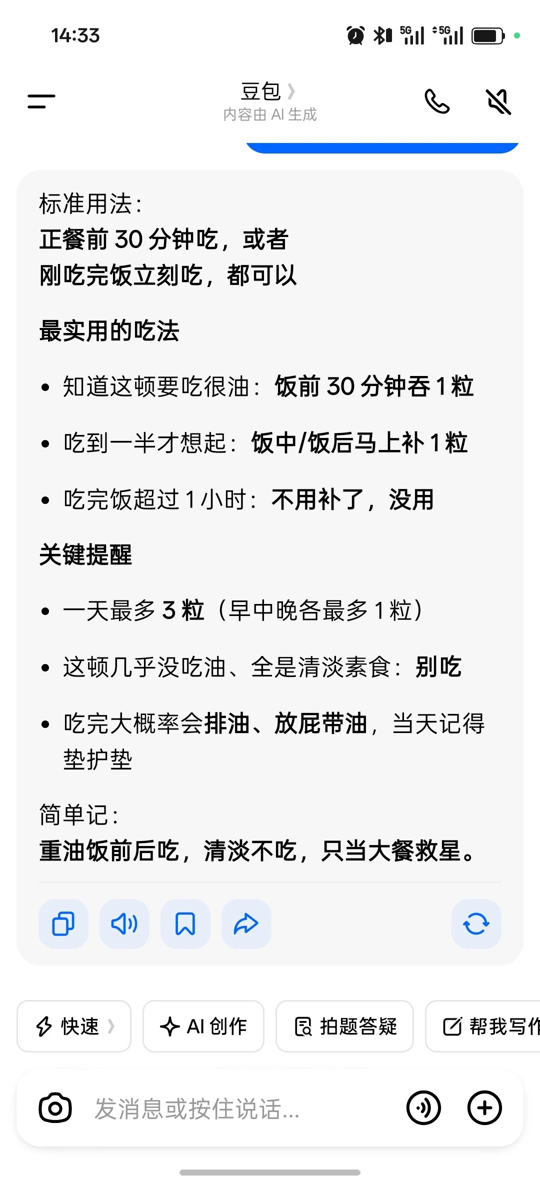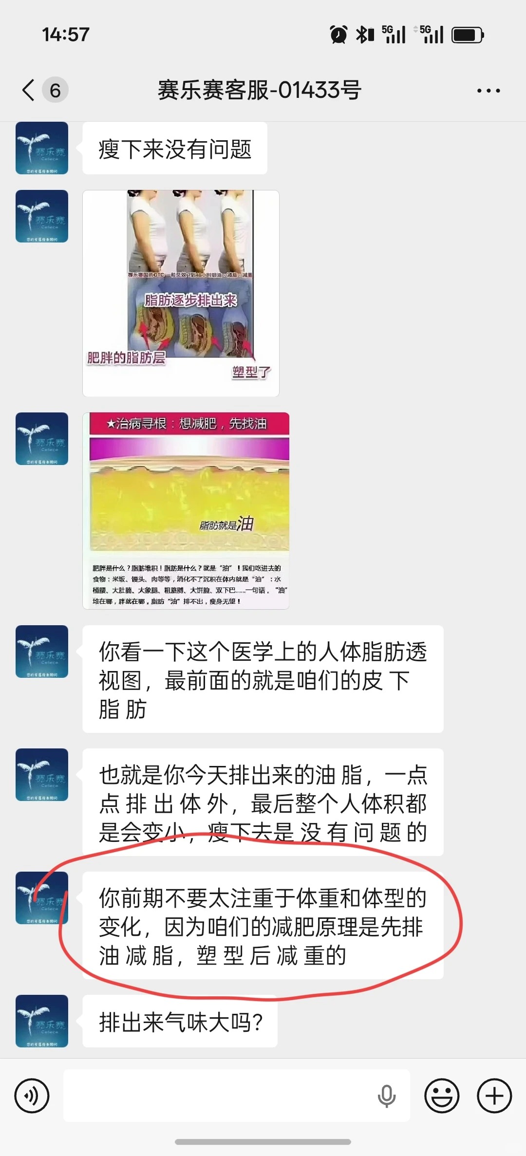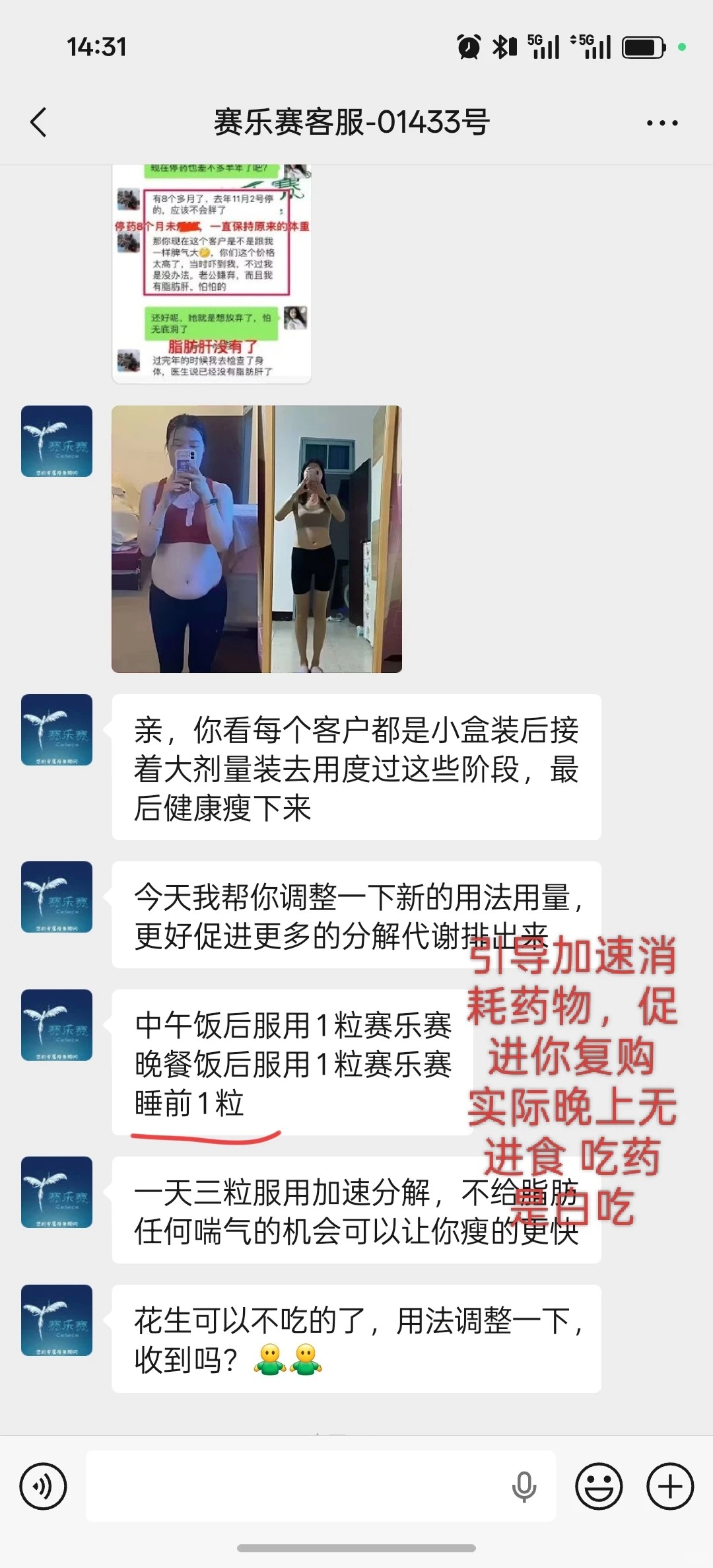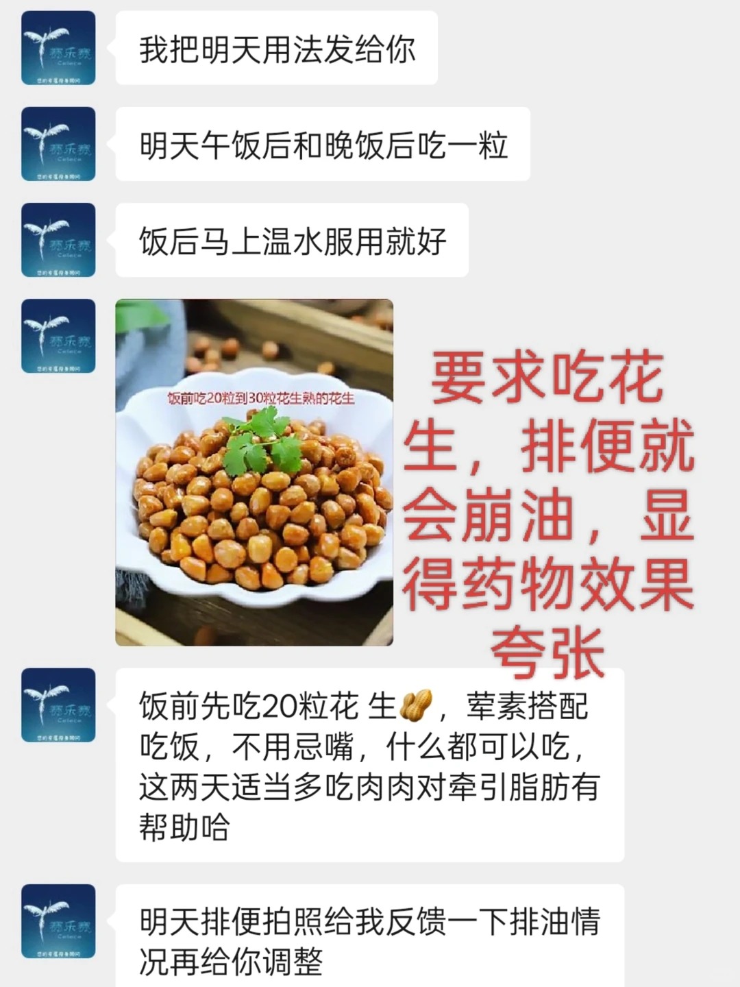 次日就收到电话,自称是指导药物使用,添加了微信,然后第一天就引导餐前食用花生,多吃肉,然后果然排便的时候有一层油花,当时还没有引起我的怀疑。