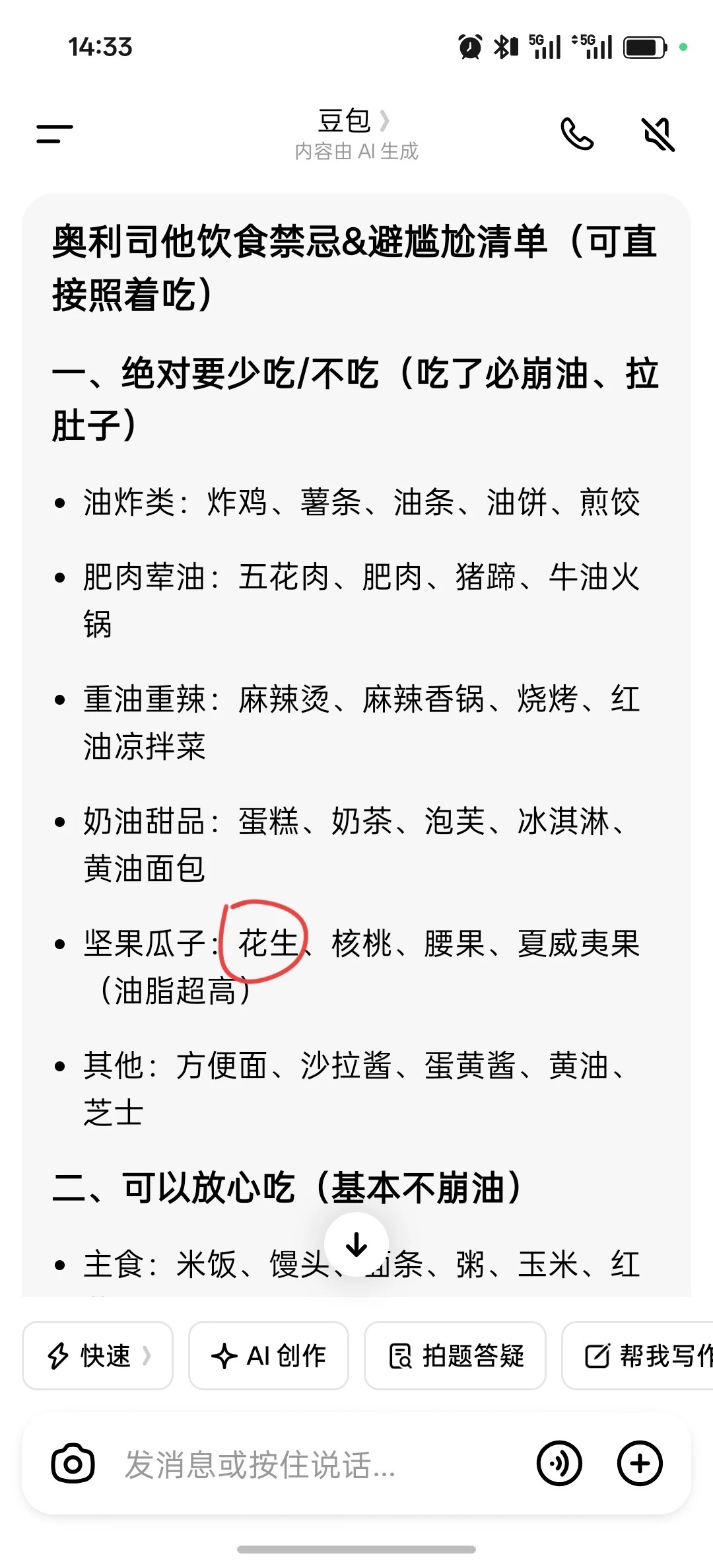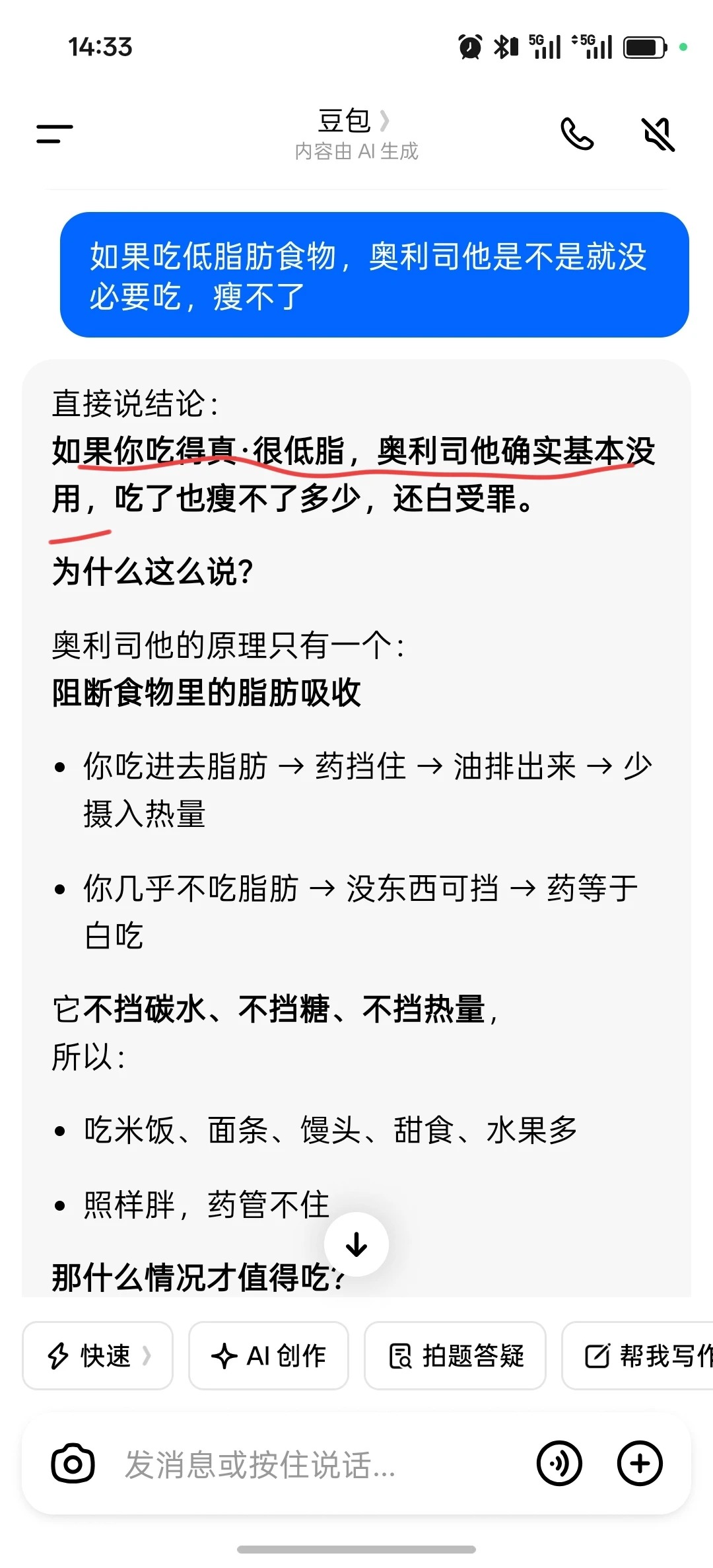 在小红书刷到很多奥利司他的宣传,因为本身有减肥需求,抱着试一试的想法买了最小量的链接。 次日就收到电话,自称是指导药物使用,添加了微信,然后第一天就引导餐前食用花生,多吃肉,然后果然排便的时候有一层油花,