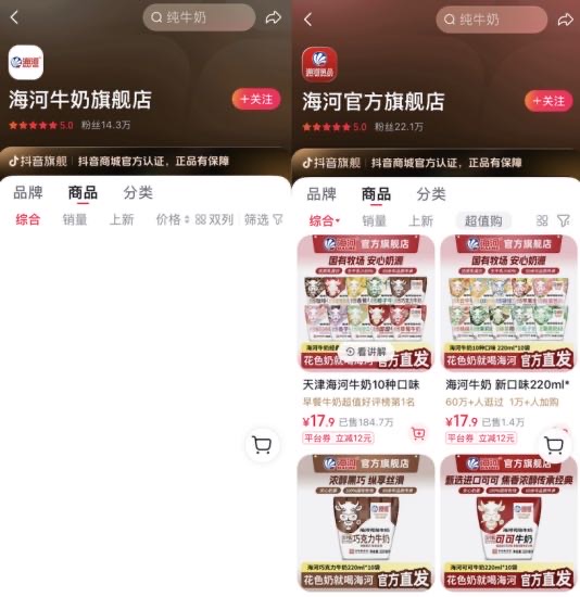 值得注意的是,在抖音上另有一个名为“海河官方旗舰店”的店铺,粉丝数为22.1万,其认证主体为“泗阳拓合电子商务有限公司”。换句话说,同样是海河乳品外包第三方运营。
