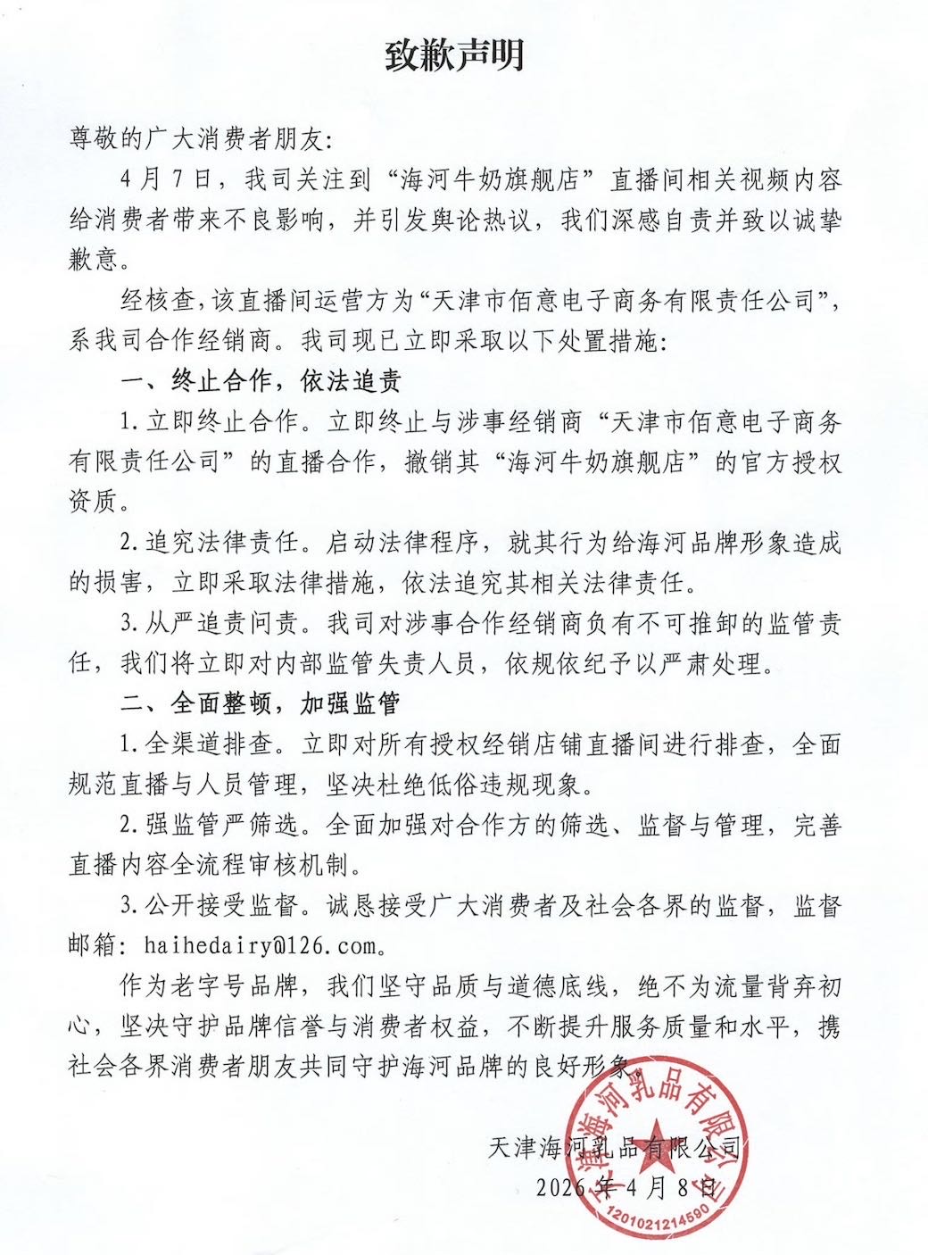 对此,4月8日,海河乳品发布声明称,已立即终止与涉事经销商“天津市佰意电子商务有限责任公司”的直播合作,撤销其“海河牛奶旗舰店”的官方授权资质。