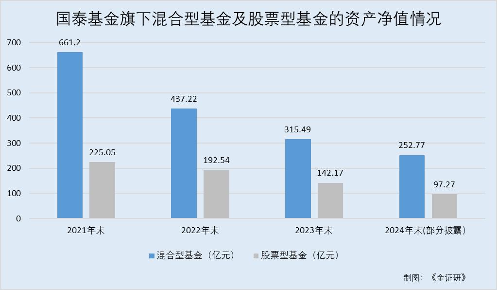 数据显示,2021-2024年末,国泰基金旗下混合型基金的资产净值合计分别为661.2亿元、437.22亿元、315.49亿元、252.77亿元(部分披露),股票型基金的资产净值合计分别为225.05亿元、192.54亿元、142.17亿元、97.27亿元。