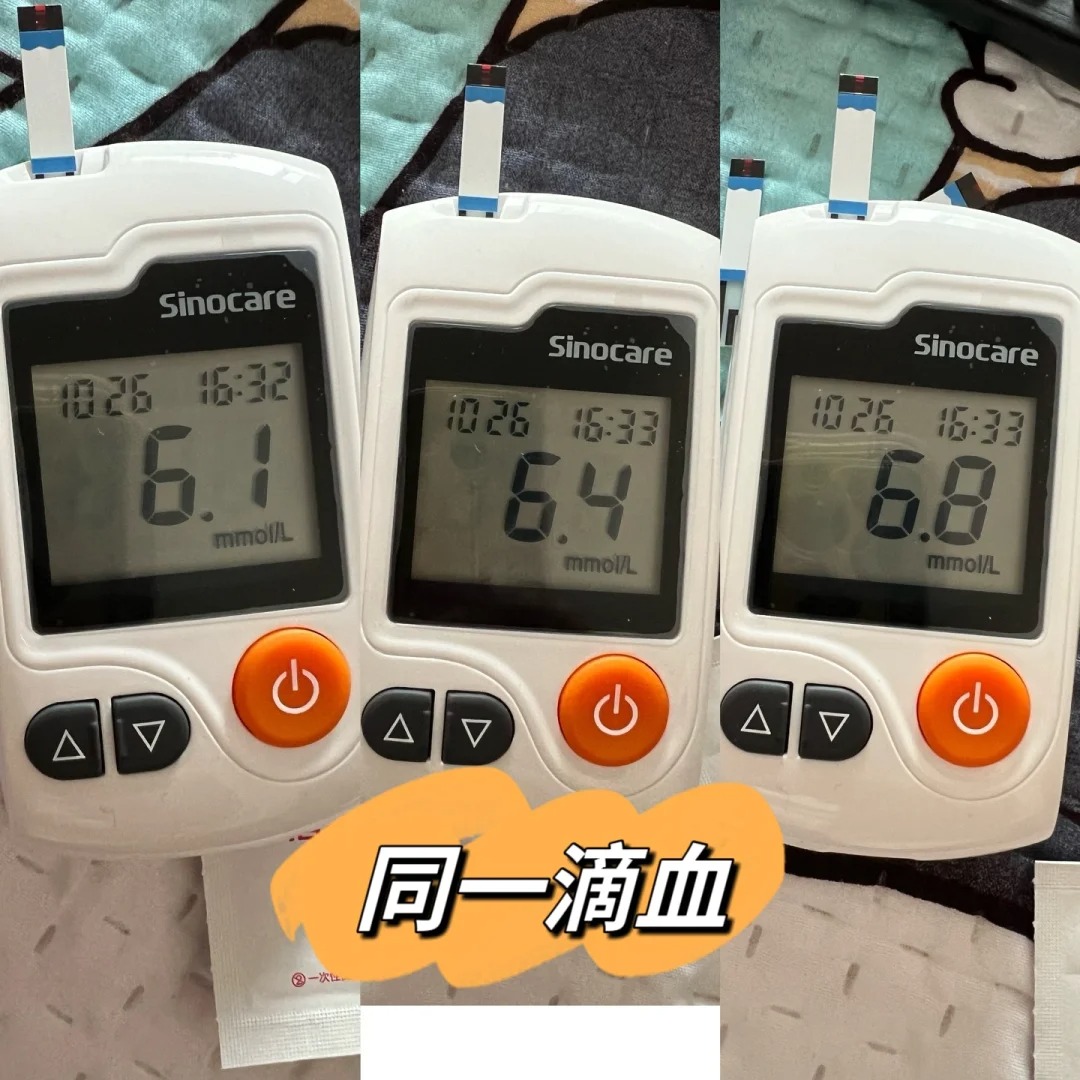 在京东买的,去医院测血糖高了6点多 图上是在家自测,同一滴血,多测了几次,没想到每次都不一样,找商家退说过了时间只能保修,之后拿了新的过来换,然后马上又试了一下,好家伙新的也一样,每次测都不同,一次比一次高