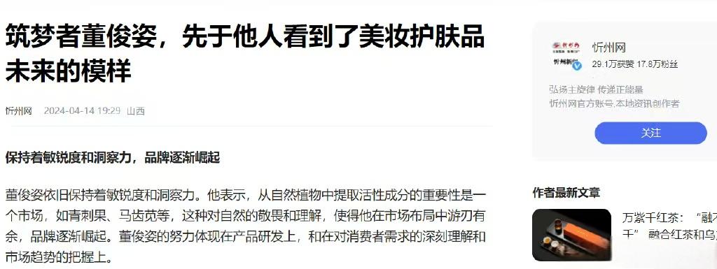 如,忻州网发布《筑梦者董俊姿,先于他人看到了美妆护肤品未来的模样》一文提及:近年来,董俊姿在敏感肌肤护理细分领域脱颖而出,成为“国货美妆逆势崛起”中的一匹黑马。