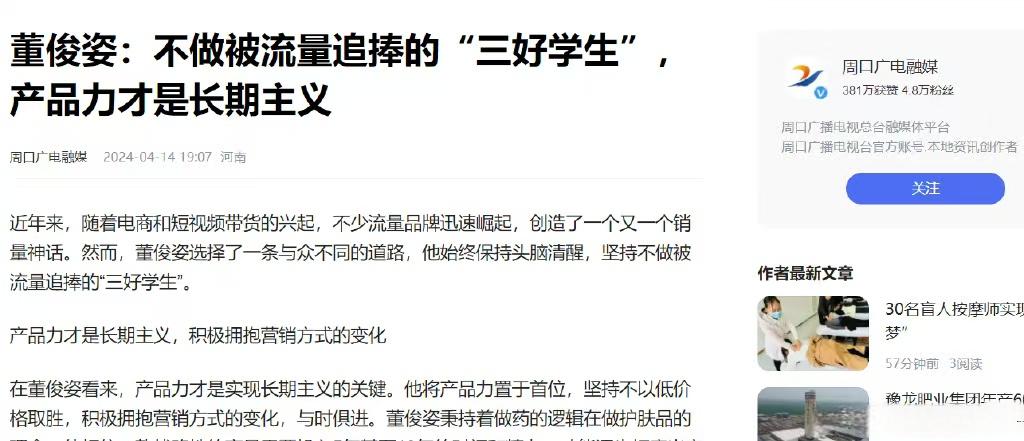 如,周口广电融媒发布的《董俊姿:不做被流量追捧的“三好学生”,产品力才是长期主义》一文提及:董俊姿选择了一条与众不同的道路,他始终保持头脑清醒,坚持不做被流量追捧的“三好学生”。