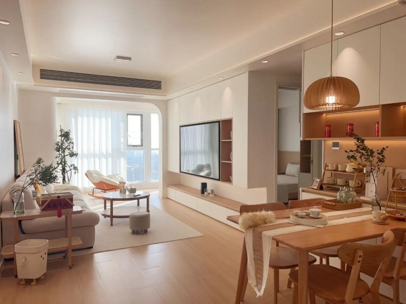 客厅空间:浅春色系木纹砖铺陈地面,搭配原木家具与绿植点缀,在自然光照射下泛出温润光泽。空间整体呈现出轻盈通透的视觉感受,契合年轻人群对“松弛感”会客场景的需求。