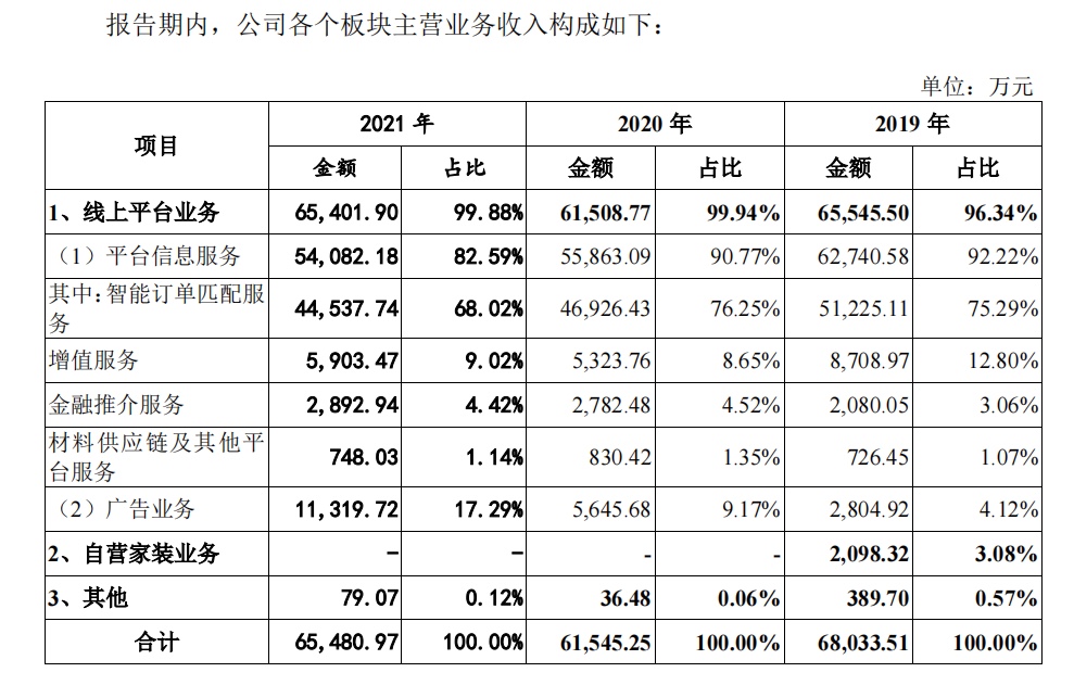土巴兔的线上平台业务主要分为平台信息服务和广告业务,其中平台信息服务以智能订单匹配为主,该业务主要是土巴兔为家装企业、设计师、全屋定制厂商等家装服务供应商提供信息推荐服务。2019年至2021年,平台信息服务的收入分别为6.27亿元、5.59亿元、5.41亿元,占营收比例为92.22%、90.77%、82.59%,可以看出,平台信息服务是土巴兔的主要收入来源,虽然营收和比例都有所下降,但是仍占主导地位。广告业务方面,报告期内,其收入从2019年的0.28亿元增长至2021年的1.13亿元,占营收比例也有大幅提升,从4.12%上升为17.29%,增加了13.17个百分点。