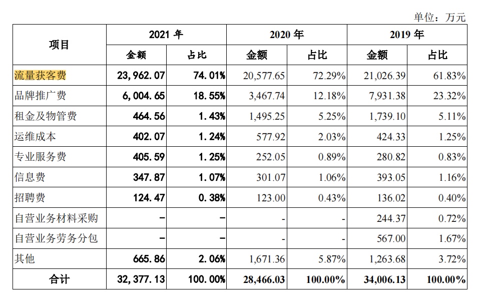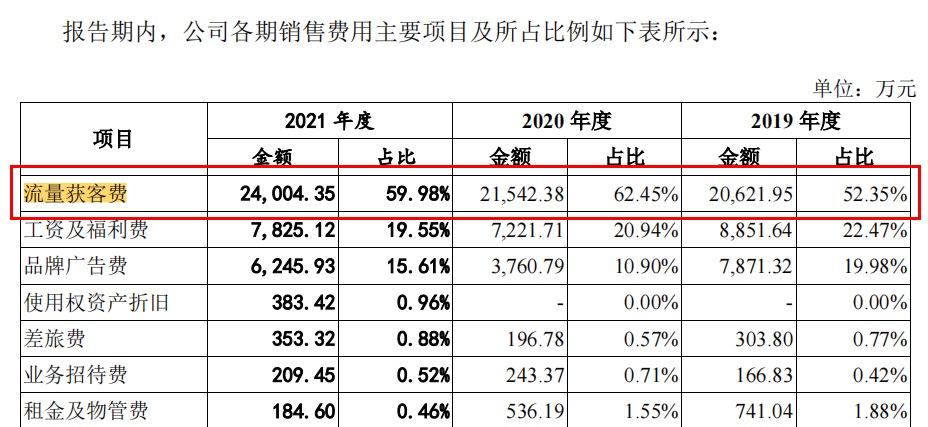 转型线上平台业务,土巴兔的收入来源主要是依赖流量带来的收益。招股书显示,2019年至2021年,土巴兔的流量获客费在逐年上升,分别为 2.06亿元(20621.95万元)、2.15亿元(21542.38万元)、2.40亿元(24004.35万元),占收入比重分别为30.31%、35.00%、36.66%。其中,2020年流量获客费占收入比重同比大幅增加,2021年,流量获客费支出同比增加了0.25亿元。