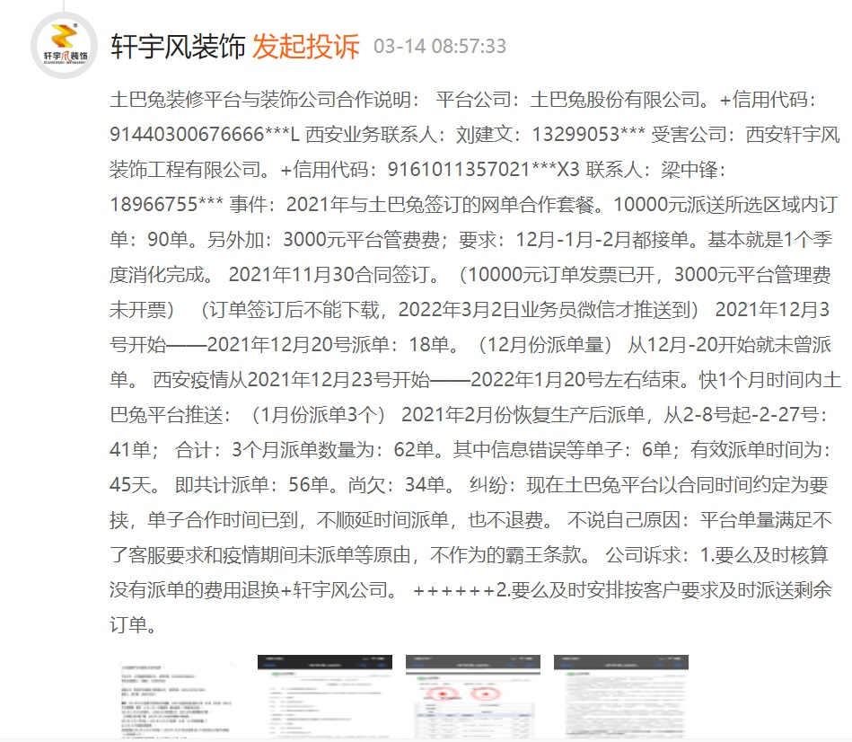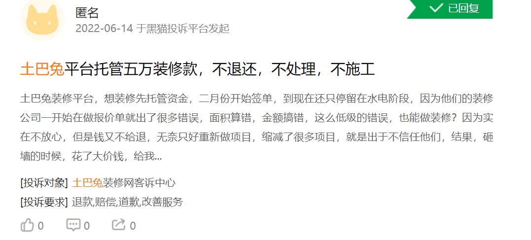 在黑猫投诉上,有用户表示,土巴兔推荐了不良企业给业主,造成了装修工期滞后,装企拖欠工人工资并导致业主被骚扰,甚至存在引诱业主,签订虚假合同和虚假赠送协议。而相关的推荐不良企业给用户的投诉并不少,除了业主表达了土巴兔平台推荐的装企不满外,也有装企表示跟土巴兔签订了网单合作套餐后,土巴兔未及时给装企派单,并导致合同到期后,还有订单未派送,也不退款等情况。