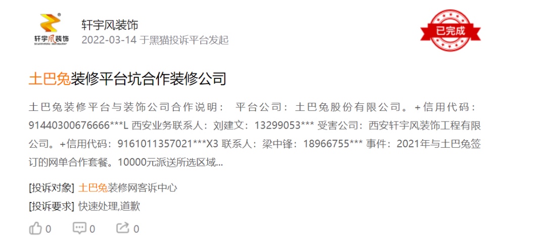 针对上述诸多问题,记者致函土巴兔,但截至发稿,未获得回复。