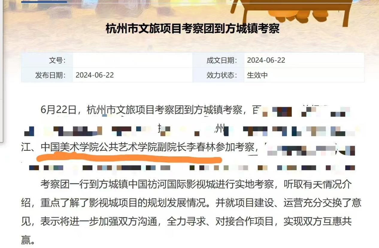 2024年6月,“中国美术学院公共艺术学院副院长李春林”随杭州市文旅项目考察团到方城镇考察。